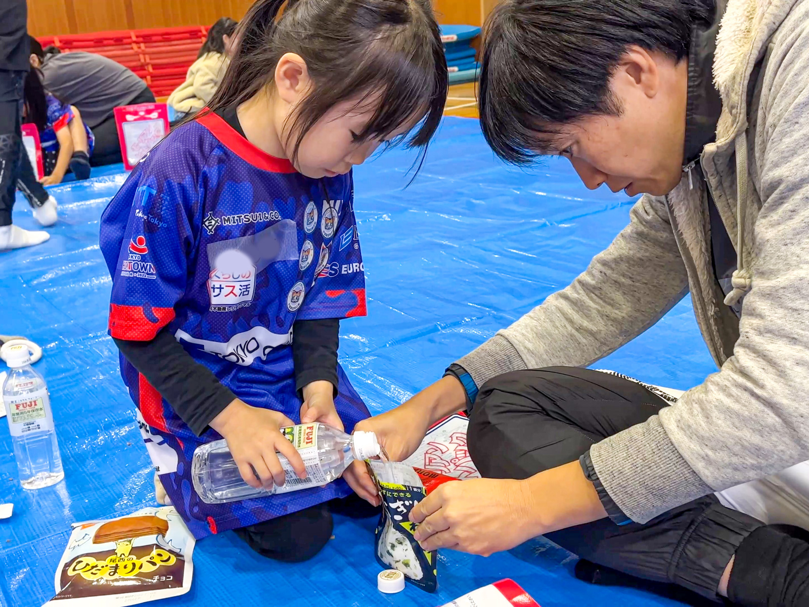 グラウンドで行われた防災サッカーのあと、体育館で避難所体験と備蓄食試食会が行われました。